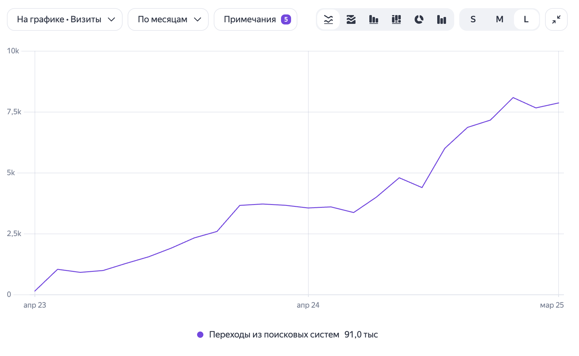 Рост органического трафика: х7раз, 47% запросов вывели в ТОП-5 Яндекса